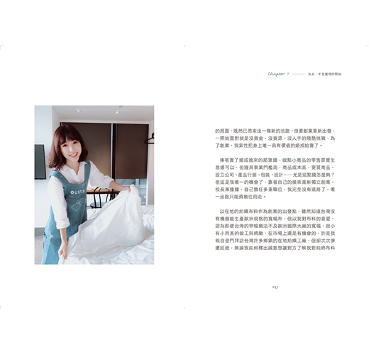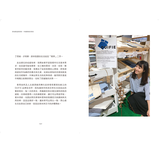 善用自然及人文資源進而轉化這份領悟實現在創立的OUIFIE 品牌信念中,因為寢具布料與日常生活是如此的緊密相扣,每一次的清洗,棉纖維回到水裡洗滌和烘乾的過程,彷彿經歷再一次的循環更新,讓它可以再度呼吸,重沐清新,也因此對於原物料堅持的我還是只挑選純粹天然的棉,並且品質好一點,讓床單可以用久一點,用心過生活友善自己的家,就是友善未來日子的步驟開始。