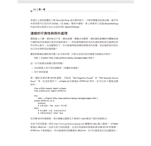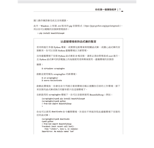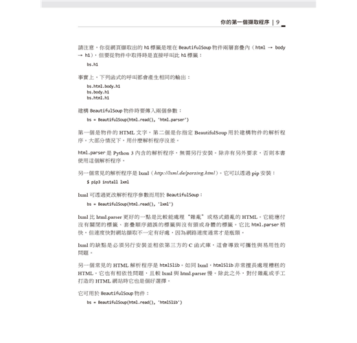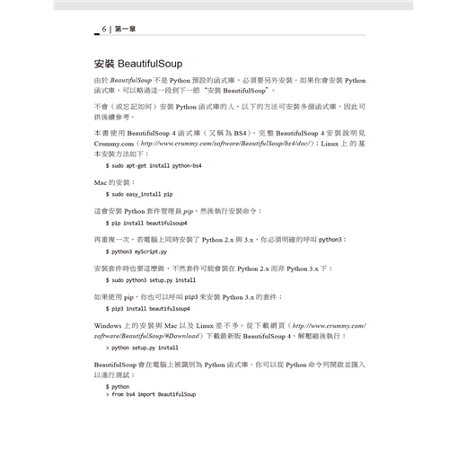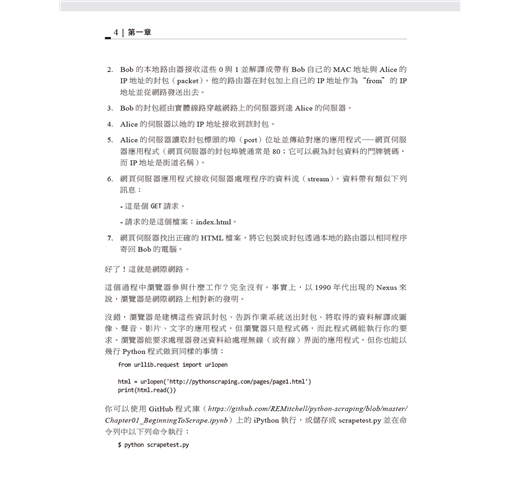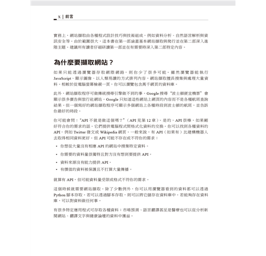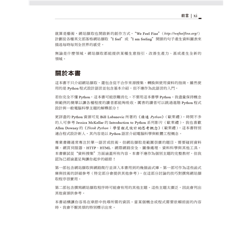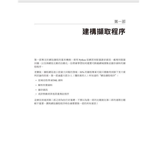 本書第一部份專注於網站擷取機制:使用Python從網頁伺服器取得資料、執行伺服器回應的基本處理工作、以及與網站的自動化互動。第二部分探索適用於不同擷取場景的各種工具與應用程式。