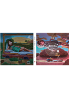 After the exhibition, despite some degrees of popularity, Chan soon gave up on focusing on the only and narrow theme. Conscious of the overflowing of Japanese Animation in his generation, he needed to find out a more recognizable personal style. Thus, his works in 2012-13 got rid of his creating style before. Looking at these new works, viewers seem to be brought back to the surrealist atmosphere in his university period. The construction of picture relies repetitive icons and its extended symbol system. These elements are lined by the artist with his own specific ways. His ways of expression is quite regular: recognizable girl figures (despite varied in costumes), means of transportation (e.g. car, train, ship. Airplane, truck, excavator, racket… and son on), communication devise (e.g. DV, television, movie player, screen…etc), house, furniture (sofa, bathtub, table, bed, greenhouse), plants and animals. All of the elements are arranged in particular “scenery” (rivers, lakes, oceans, islands, deserts, cliffs and sky) using surrealist skills (imbalance of proportion, anti-gravity, irrational space and time). Human figures, objects and scenery are combined in infinite changes and the model system, such as colorful hues and animation figures, deriving from previous period together enable Chan to develop his narrative structure. Only if, what actually the narrative structure is? This needs further interpretation.