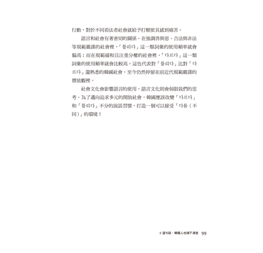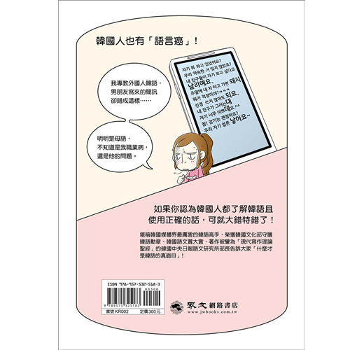 曾榮獲韓國文化部守護韓語勳章、韓國語文賞大賞,甚至著作被譽為「現代寫作理論聖經」的作者裵相復,嚴選 95 個韓語的例子,告訴大家這些韓語的發展與來歷。現代韓語的變化有些可能已經歪到讓當初創制韓文的世宗大王也難以諒解;有些擁抱了時代的影響而形成了韓語特有的現象;有些就像我們使用中文一樣,因長久以來寫錯字、用錯詞而致積非成是。如果你不懂韓語,可以利用這本書了解韓國與中國、日本有點像又不太像的語言文化思維;如果你正在學韓語,或對韓語有興趣,這本書剛好可以告訴你「連韓國人也不知道的韓語」!