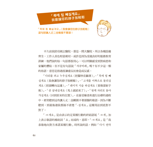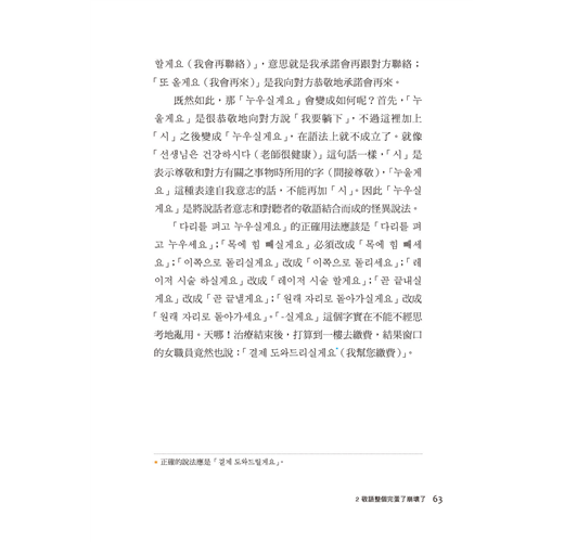 ――連韓國人自己也常用得暈頭轉向的就是韓語的「敬語」了!依對象、場合的不同,用字遣詞、整體句子的表現都不同,因此同樣意思的句子可以有很多不同的說法。也因為複雜的敬語系統,出現過度使用敬語、根本用錯敬語,甚至對無須致敬的「東西」也使用敬語,真的讓資深媒體記者不得不站出來為正確韓語發聲啊!