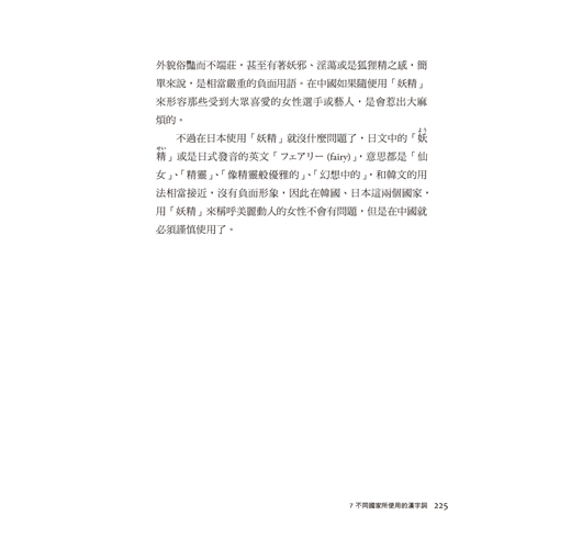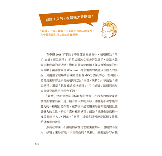 ――韓語雖然深受中國、日本文化影響,許多字詞都有中文、日文的影子,但意思已經大不同了。在韓國申辦2018年平昌冬季奧運時,花式滑冰女王金妍兒優雅迷人的儀態被大讚為「국민 요정(國民妖精)」。同樣是「妖精」,卻不是我們印象中妖邪不正經的狐狸精,而是每個韓國女性都希望獲得的極佳讚美呢!