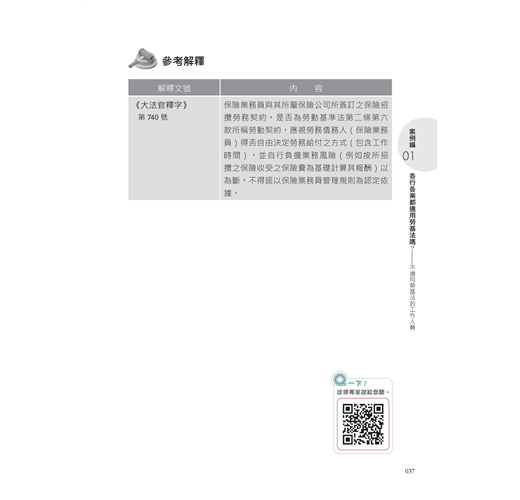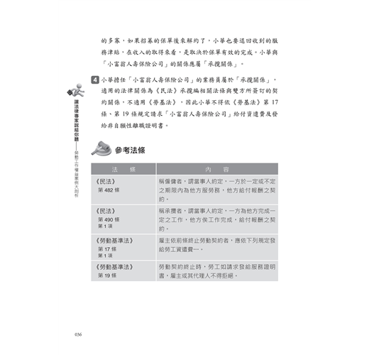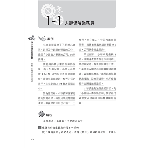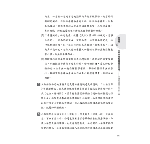 案例後附相關法令、解釋法規全文,便於讀者隨即掌握相關法條內容。部分案例末,另有「註」、「法律小寶典」、「給雇主的話」、「給受僱人的話」等提示叮嚀。