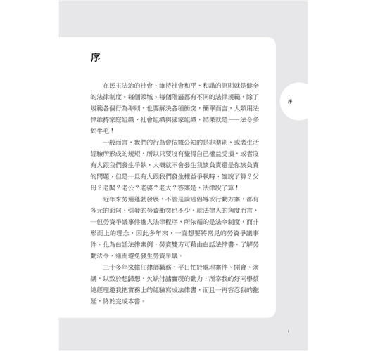 作者藉由法律規範與實務見解,以淺顯口語之行文方式,讓所有的勞動朋友、事業經營者,能瞭解常見之勞資爭議。透過本書的案例分析,希望能避免勞資發生爭端。
