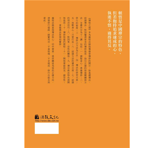 《禪悟之道》本為繼程法師指導僧眾禪修的開示,除基礎禪法、話頭禪法,特別釐清常見的禪修迷思,指引正確的悟道關鍵與方法。全書共分為十二講,包括:一、調整身心,準備禪修;二、修行的態度;三、禪修以方法為正念;四、禪法的修習次第;五、放鬆身心,只管打坐;六、話頭方法的運作次第;七、話頭的用功技巧;八、對因果、空性的體悟;九、禪宗教法特色與開悟迷思;十、禪修悟道的歷程;十一、開悟要破我見、證空性;十二、掌握佛法原理如實修。