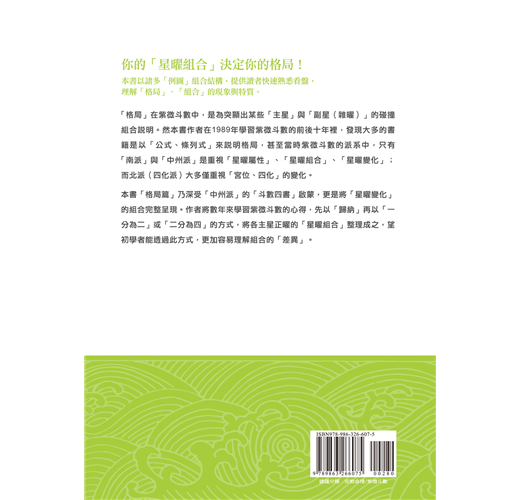 本書「格局篇」乃深受「中州派」的「斗數四書」啟蒙,更是將「星曜變化」的組合完整呈現。作者將數年來學習紫微斗數的心得,先以「歸納」再以「一分為二」或「二分為四」的方式,將各主星正曜的「星曜組合」整理成之,望初學者能透過此方式,更加容易理解組合的「差異」。