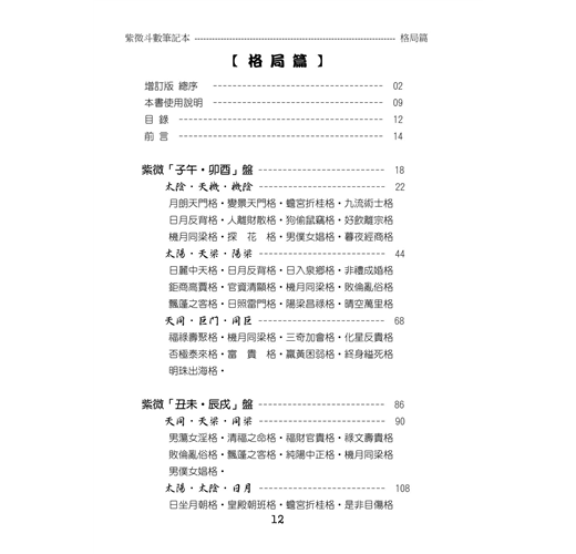 此次的「增訂版」,更是將「紫微斗數筆記本」系列的「主星篇」、「副星篇」、「格局篇」、「論命觀念篇」再做一次編排與整合,讓讀者在閱讀或學習上,透過增加的圖檔來理解或找尋相關資訊。