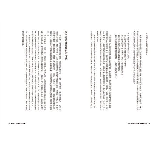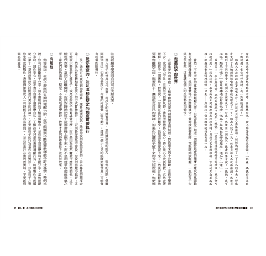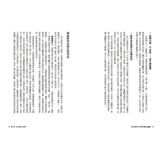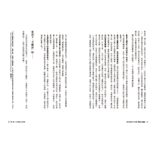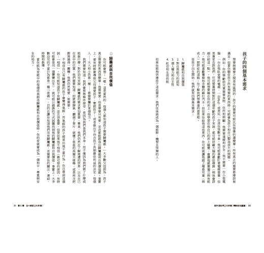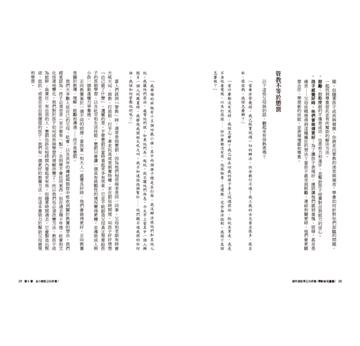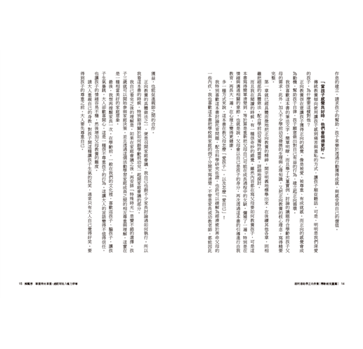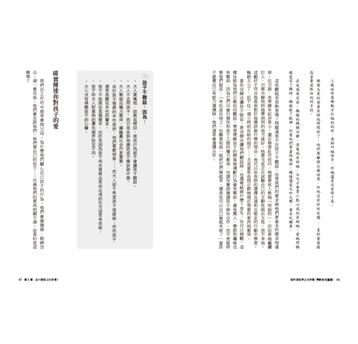 而且我在閱讀的時候,有一種很奇妙的錯覺。雖然內容都在寫父母要如何教養孩子,可是這本書寫得簡單清楚到,等於算是重新把父母自己可能在成長過程中的欠缺,彌補了一遍,特別是在情緒與溝通相關的章節。也就是說,父母會以自己是孩子的身分,再次透過這本書的引導進行自我教育,再長大一遍,在心理上變得更健康。