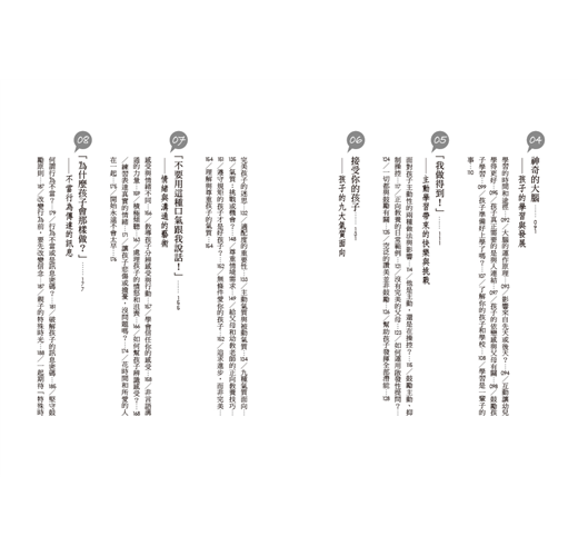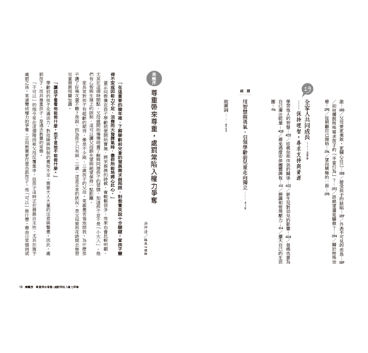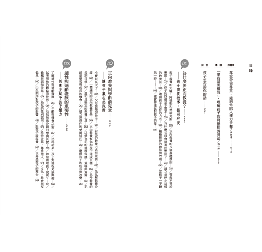 小寶貝長大了/父母該學習放手/有效的教養方式很重要/先化解教養分歧/一體適用的教養哲學/讓你和孩子享有成功體驗/對於教養的思考、夢想和計畫/溫和且堅定的教養工具/過度保護、羞辱與責備,都以愛為名/犯錯是學習與成長的機會/建立無條件的愛與信任/歌頌孩子的成長與改變