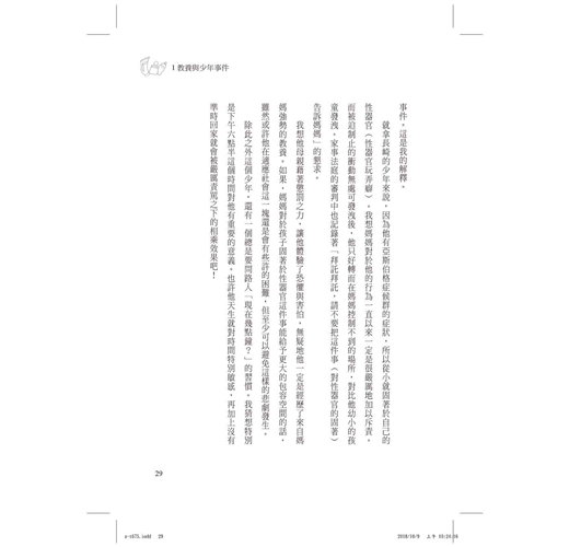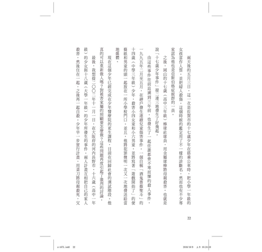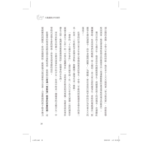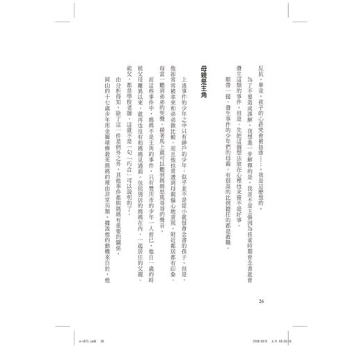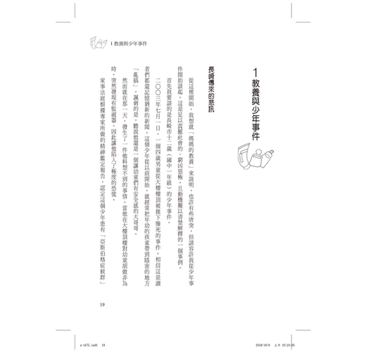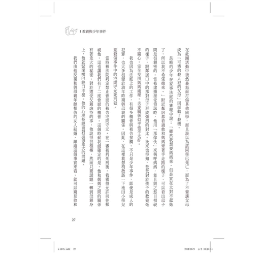 我第一次和拓也見面是在少年拘留所。送至刑事法庭時,他才十七歲。對於初次見面的我,他伸直背、正視我,很有禮貌地對我鞠躬說:「請多多指教!」他那種「我會反省」、「我不想再犯同樣的錯」的有禮樣子,深深烙印在我的腦海。然而,這可以說和真的更生相去甚遠,而且讓人覺得非常痛心。「教養後遺症真的是很嚴重的啊……」這是我那個時候的印象。