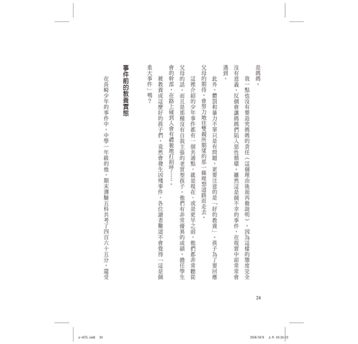 看到書封上的文字而覺得刺眼的人應該很多吧!孩子如果不好好教養,不讓他學會必要的生活態度,以後就會成為學習怠惰,碰上討厭、難處理的事就會躲得遠遠的大人吧!當這種大人一多,社會就會變得腐敗……。