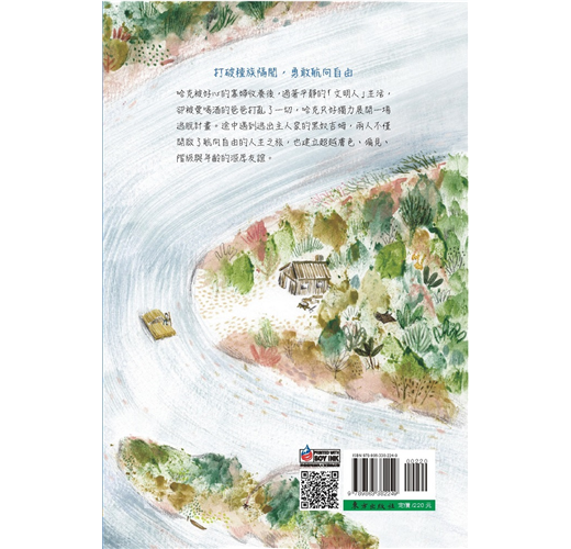 沒想到,這座無人島上不只哈克一人,還有華森小姐家的黑奴吉姆。原來,吉姆想逃到南方,尋得自由。於是,哈克和吉姆駕著木筏,一路南逃。在這趟旅程裡,哈克被迫接觸到人性中自私、殘忍、愚昧等等「黑暗面」,也接觸到善良、敦厚、天真的「光明面」。在經歷種種困境後,他和吉姆這位值得信賴的夥伴終於順利、平安的達成了追求自由的理想。