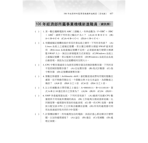 書末收錄試題及解析,保證時效最新、解析最精、收錄最全,歷年試題的統整,利於掌握考試最新脈動與命題方向。本書將104~107年試題一網打盡,毫不保留,經過名師詳解,類似的題目再出個一百次,也不害怕!輕鬆學習、快速理解,掌握命題趨勢,必定能在考場所向披靡!