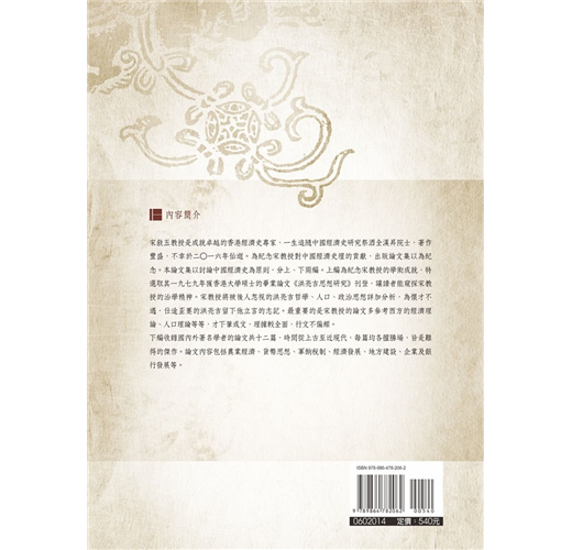 宋敘五教授是成就卓越的香港經濟史專家,一生追隨中國經濟史研究祭酒全漢昇院士,著作豐盛,不幸於二○一六年仙逝。為紀念宋教授對中國經濟史壇的貢獻,出版論文集以為紀念。本論文集以討論中國經濟史為原則,分上、下兩編。上編為紀念宋教授的學術成就,特選取其一九七九年獲香港大學碩士的畢業論文《洪亮吉思想研究》刊登,讓讀者能窺探宋教授的治學精神。宋教授將被後人忽視的洪亮吉哲學、人口、政治思想詳加分析,為懷才不遇,仕途歪蹇的洪亮吉留下他立言的志記。最重要的是宋教授的論文多參考西方的經濟理論、人口理論等等,才下筆成文,理據較全面,行文不偏頗。 下編收錄國內外著名學者的論文共十二篇,時間從上古至近現代,每篇均各擅勝場,皆是難得的傑作。論文內容包括農業經濟、貨幣思想、軍餉稅制、經濟發展、地方建設、企業及銀行發展等。