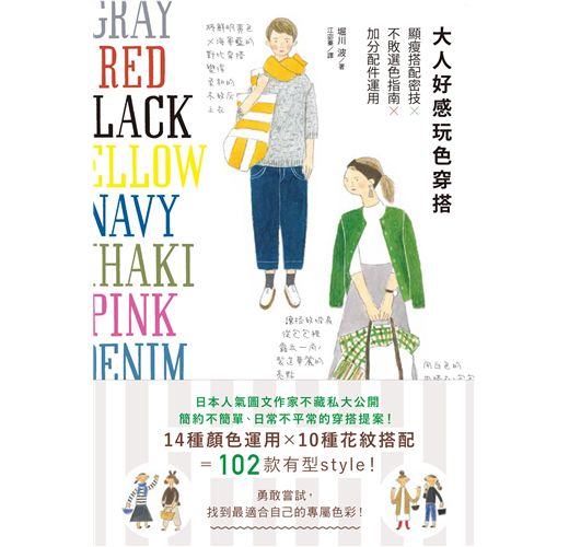 受到廣大女性讀者喜愛的日本人氣圖文作家堀川波,這次同樣透過細膩的觀察與溫柔的筆觸,分享自己獨到的穿搭心得──簡約風格,加上一點點玩心,教導讀者運用基本色、點綴色、各式花紋、加分配件,甚至是髮彩,打造專屬自己的style,盡情享受玩色時尚的樂趣!