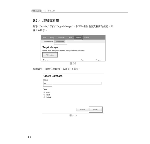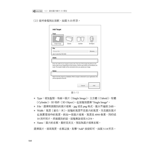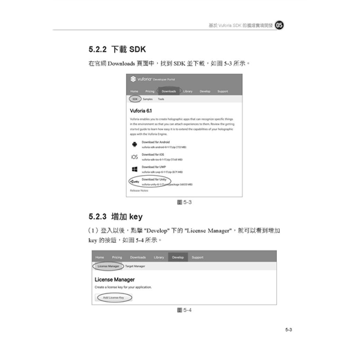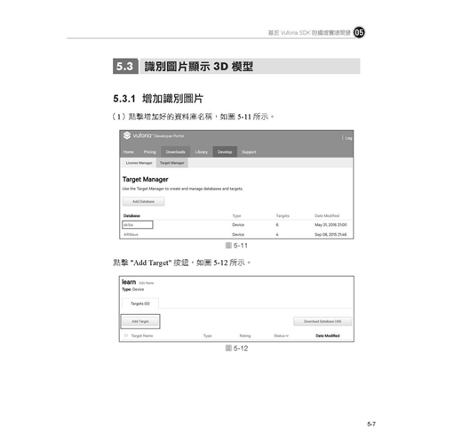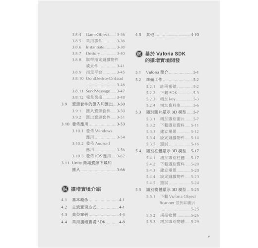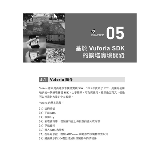 第4~6章是擴增實境開發。該部分介紹了擴增實境的基本概念、一些優秀的實例,並詳細說明了用Unity3D和Vufoira、easyAR兩款擴增實境SDK開發圖片識別顯示3D模型視訊的過程。