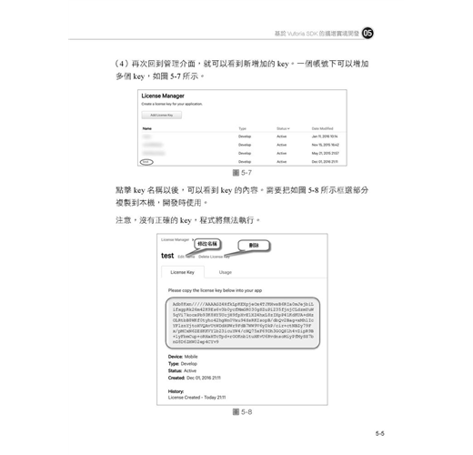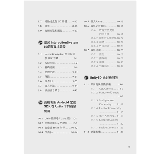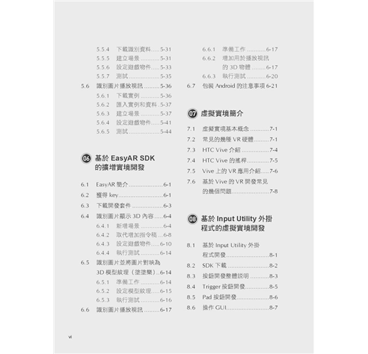 第7~9章是以Vive為基礎的虛擬實境開發。該部分介紹了虛擬實境的基本概念,如何利用官方提供的SDK進行Vive的虛擬實境開發。其中詳細說明了兩個不同的外掛程式如何對Vive進行開發,包含基礎按鈕到常用按鈕的傳送、UI、拾取等。