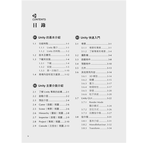 第1~3章是Unity3D基礎介紹。前3章內容快速介紹了Unity3D的基礎、操作介面、基本概念等,讓讀者對於Unity3D有了一個整體的了解,並能進行一些基礎的操作,程式撰寫。