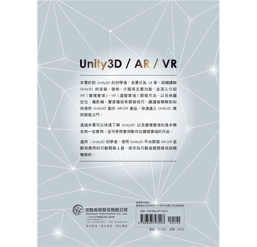 本書針對的讀者大多是沒有接觸過Unity3D的初學者。讀者可以透過本書快速地了解Unity3D以及擴增實境的基本概念和一些實例,並且快速地參照實例製作出擴增實境的作品。