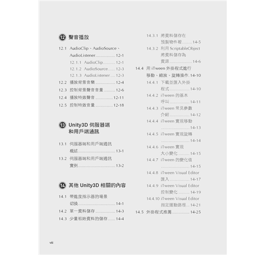 第11~14章是其他Unity3D相關的內容。該部分介紹了Unity3D開發過程中常用的一些程式片段及一些常用的Unity3D外掛程式,包含常用攝影機、聲音控制等。