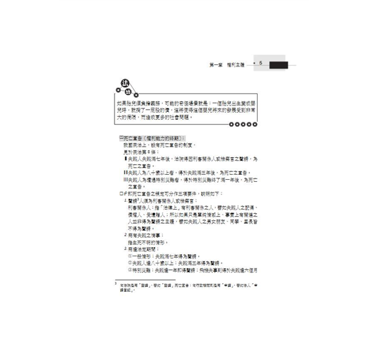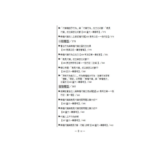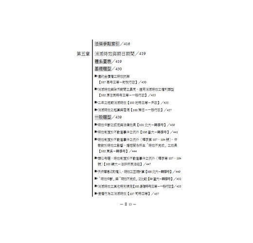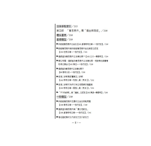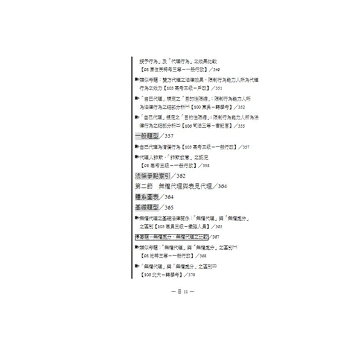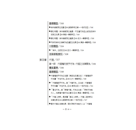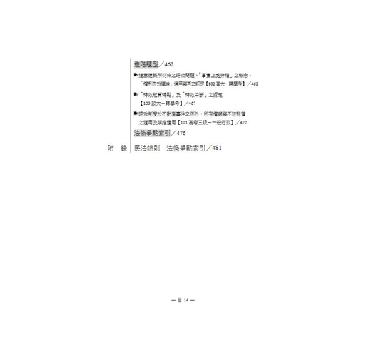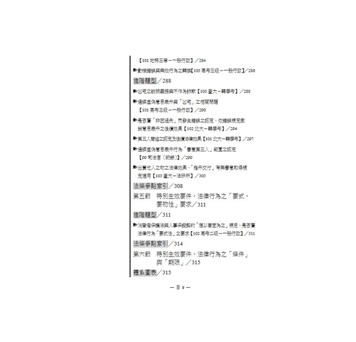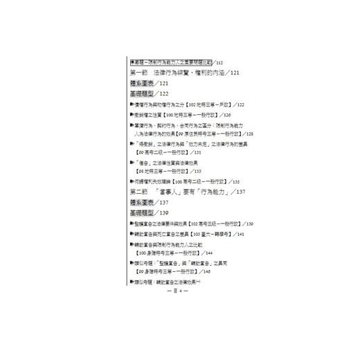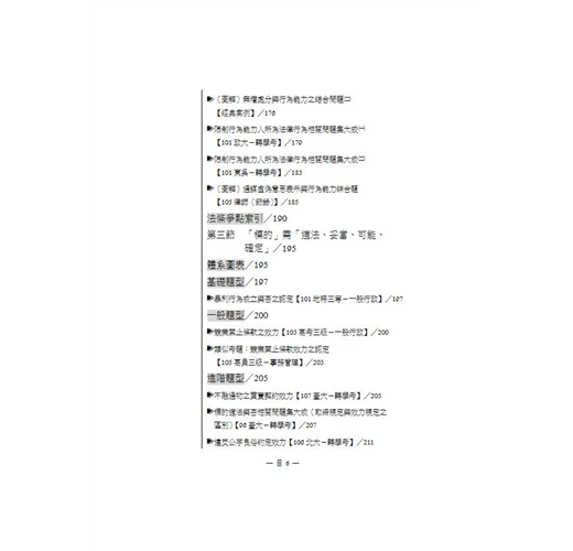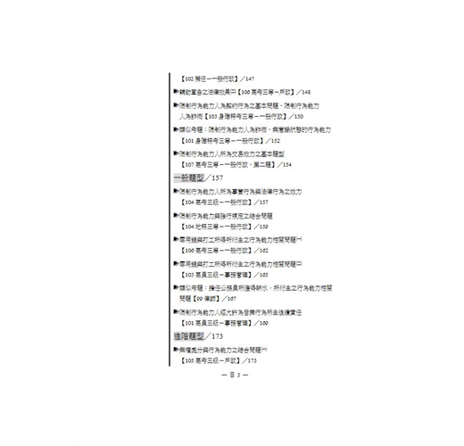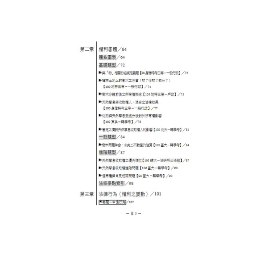 .由淺至深分類題型:每個章節均以由淺至深的方式,即『基礎題型』、『一般題型』、『進階題型』依序編排,讓即使民法總則還不熟的讀者,也能循序漸進從題目中學習。