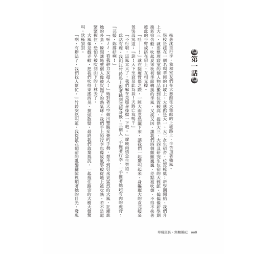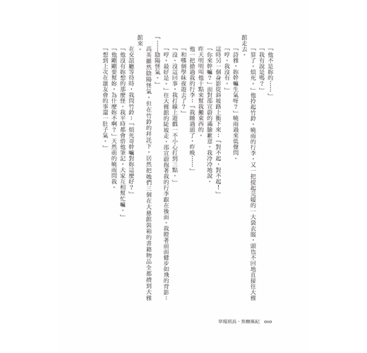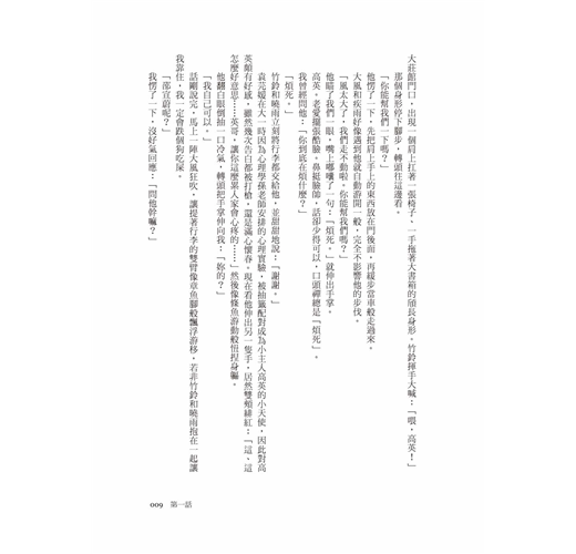 「啊,有辦法了,我們找人幫忙。」竹鈴突然叫道。我從披在額前的亂髮縫隙裡順著她的目光,發現大莊館門口,出現一個肩上扛著一張椅子、一手拖著大書箱的頎長身形。竹鈴揮手大喊:「喂,高英!」