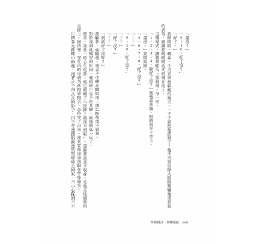 經常,我會一時心生促狹,他已經喊了「投降!我找不到啦」,還躲著故意不現身。見他在校園裡的走廊上、廁所裡、穿堂內的每個角落跑來跑去,急得哭了出來,我其實都遠遠地跟在背後偷笑。