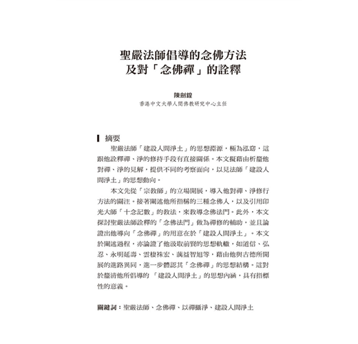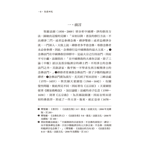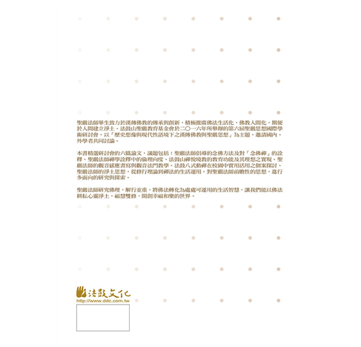 本書精選研討會的六篇論文,議題包括:「聖嚴法師倡導的念佛方法及對「念佛禪」的詮釋」、「聖嚴法師禪學詮釋中的倫理向度」、「法鼓山禪悅境教的教育功能及其理想之實現」、「聖嚴法師的觀音感應書寫與觀音法門教學」、「法鼓八式動禪在校園中實用活用之個案探討」、「聖嚴法師的淨土思想」等。從修行理論到禪法的生活運用,對聖嚴法師前瞻性的思想,進行多面向的研究與探索。