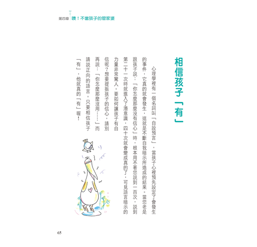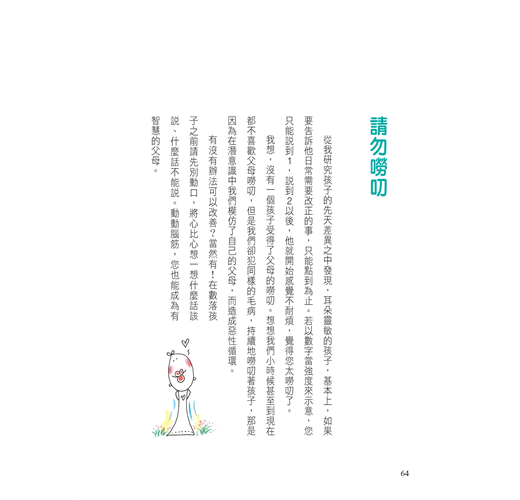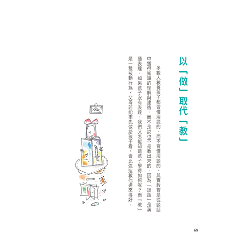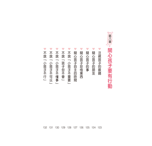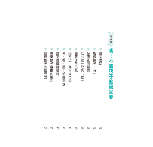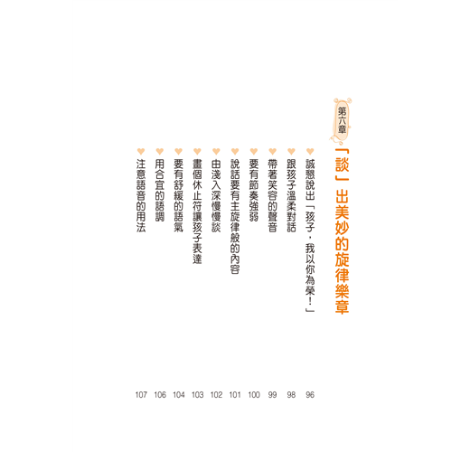 全冊共分十個章,從觀念、生活態度、教養、語氣等切入,帶領父母和老師藉由正確的談話方式,走進孩子內心、建立和孩子之間的良好關係。