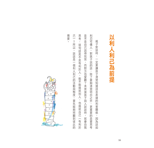 親子對談時,一定要讓孩子清楚知道語言表達的利害關係,因為話如利刃可傷人,對孩子說的話,除了要夠清楚明白之外,更重要的是要思考是不是自己說得悅耳,而對方也愛聽?未來當孩子與人談話時,就會自我思考,這句話是不是有利於人,能不能造就別人,也造就自己(有利於己)?所以,談話是一個利人利己的活動與態度,要先能夠照顧到彼此的需要。