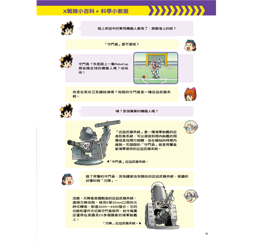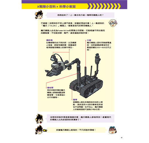STEP 2知識專區∣科學性 ★★★★★設有「X戰隊小百科」單元,藉由X機器人戰隊隊員的生動對話和淺顯易懂的文字,來介紹軍用機器人,以及無人戰機、地獄火飛彈、近迫武器系統、音速與超音速、遙控炸彈與戰車等超炫科學知識,讓小朋友有系統的學習。