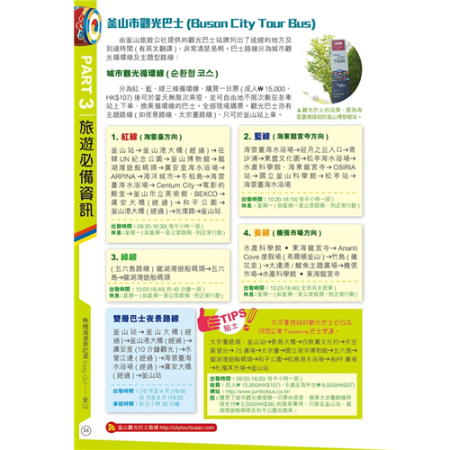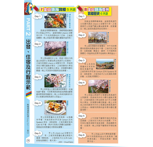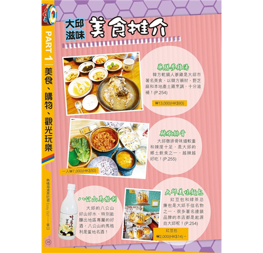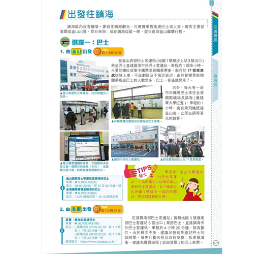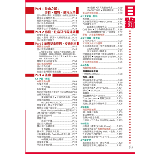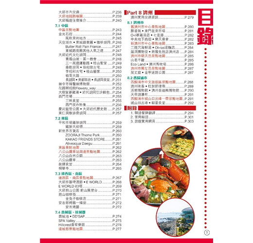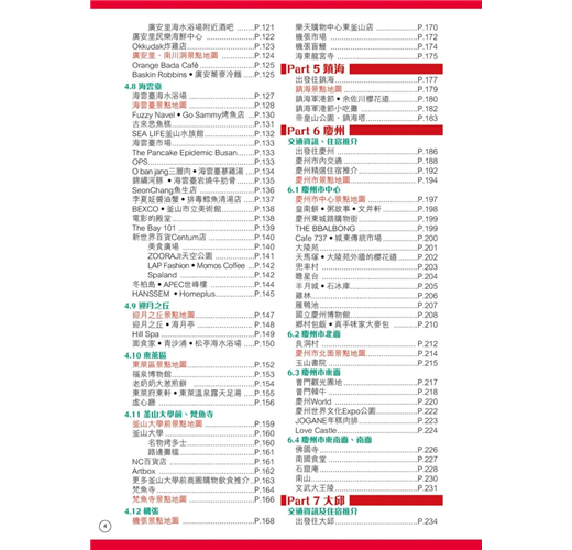 【釜山周邊】本書還收錄大邱、慶州、鎮海及濟州,遊釜山時可一併遊覽。擁有千年歷史的慶州,有4大世界文化遺產外,在古城賞櫻花或紅葉,美得像一幅畫!鎮海在櫻花季節吸引很多外國遊客及本地人特意前往,因為這裏會舉辦韓國最大櫻花慶典;位於韓國西南面的濟州島,其大自然風光及獨特美食(如黑豬肉),同樣不能錯過!大邱市匯集了不少韓國美食,又有眾多韓國近代歷史景點,同樣是不可錯過的旅遊熱點。