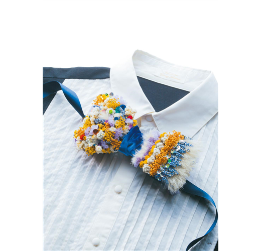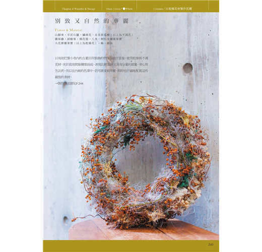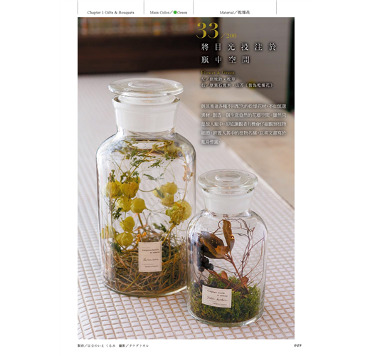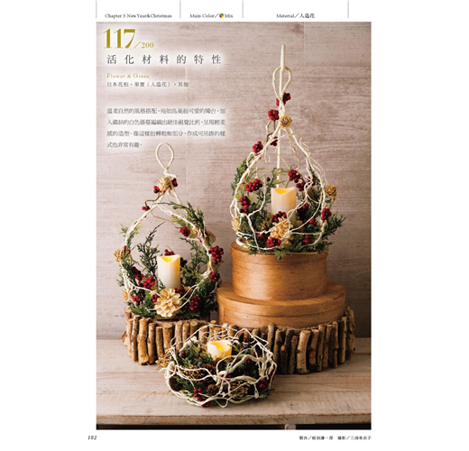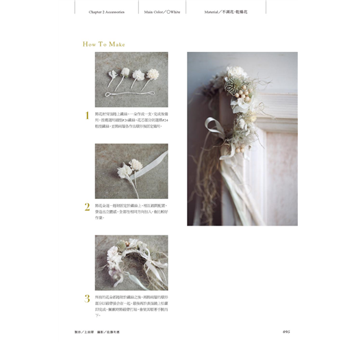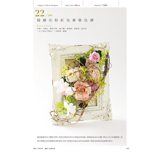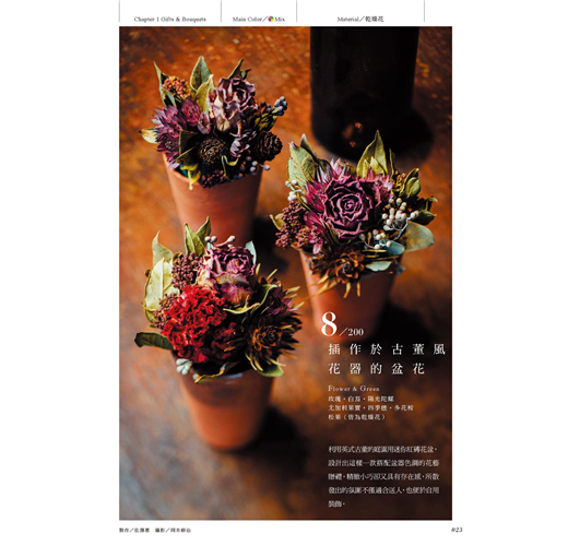 本書以「非鮮花」的三種花材為主軸,這三種素材分別是經過特殊技術加工的不凋花,以聚酯纖維或聚乙烯等材質製成的人造花,及將鮮花風乾製成的乾燥花。
