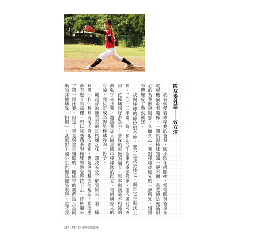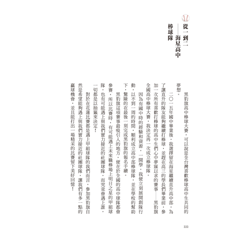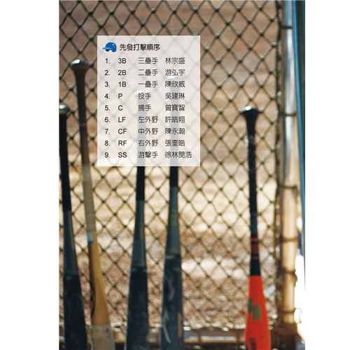 國中二年級時,成立棒球隊,開啟一連串的驚奇旅程。憑著對夢想的執著和不墨守成規的創意展現,替球隊募集到超過200萬元的經費。