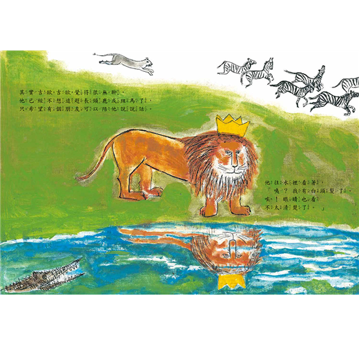 但漸漸的,吉歐吉歐老了。他坐在水邊看著自己的倒影,感嘆頭上長出白髮、眼睛看不清楚,他覺得非常無聊,希望有人能陪他說說話——我們身邊的長輩們,會不會也有這樣的心情呢?