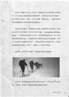 「(1959年1月23日)好吧,我們又展開了一次探險,現在我們坐在531號房裏,不是真的坐着,而是匆匆忙忙把罐頭、乾糧,還有其他食物裝進背包裏,管理物資的隊友在監察我們是不是帶齊了所有東西。然後我們上了火車,我們唱了很多歌,也學到了不少新歌。三點鐘,大部分隊員都已經入睡了,我覺得很興奮,等着我們的是一場探險。不知道這次探險會有什麼事等着我們。會發生什麼新鮮事嗎?今天,隊中的男孩子很驕傲地說着,他們一整個登山旅程都不會抽煙,我很好奇他們有沒有足夠的定力……」
