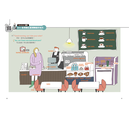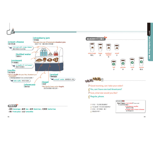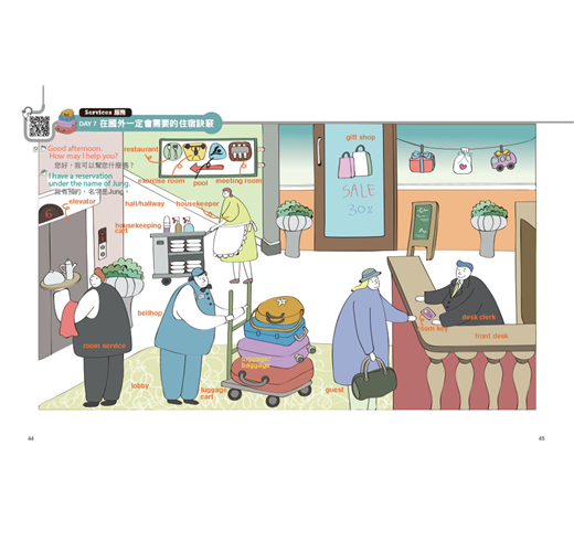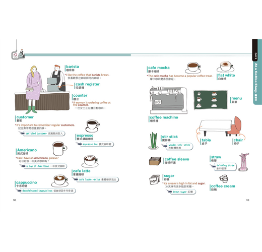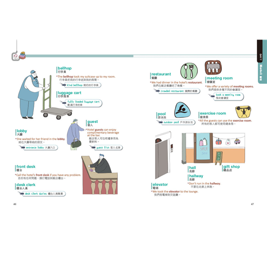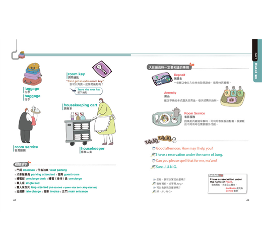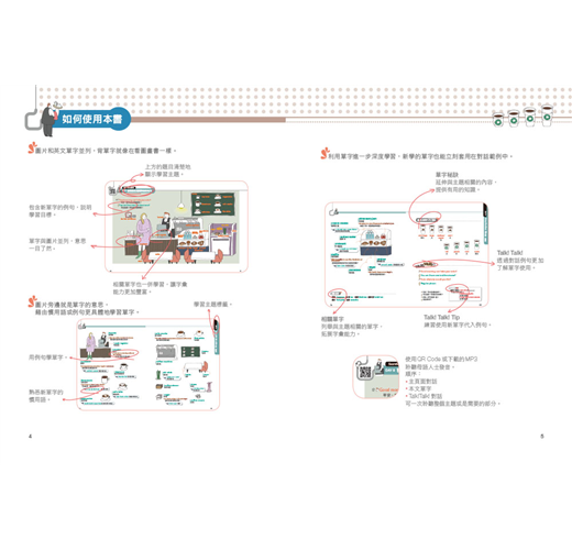 列出各情境的相關單字與會話,字彙與圖像並列,單字的意思一目了然。