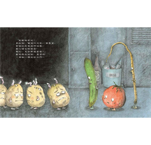 故事一開始,黃瓜、牛蒡、番茄和發芽的馬鈴薯,說著他們被人類遺忘的不滿,為了不要走向被丟掉的命運,他們相約逃家去參加集會。走上街道才發現,每戶人家都走出許多蔬菜,一個接一個排成長長的隊伍,唱著哀怨的歌前進著,蔬菜委屈又生氣的表情被生動刻畫,讓人不禁同情他們的遭遇。