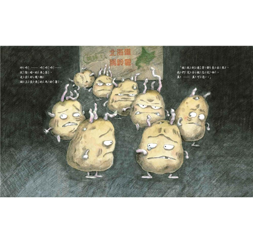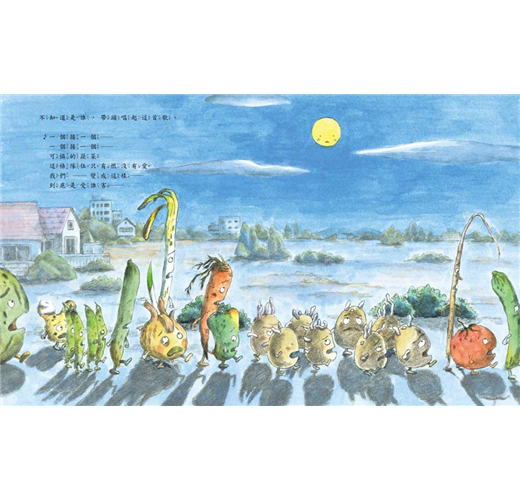 故事開始於夜晚幽暗的廚房和憤憤不平的情緒,逐漸走向豁然開朗的結局,之中的情緒轉折透過圖畫細節被精彩呈現,除了蔬菜,圖中不說話的月亮、太陽也有生動的表情,讓故事更為引人入勝。擬人化的方式也讓孩子自然而然貼近蔬菜,當害怕蔬菜的孩子看到蔬菜臉上綻放起可愛的笑容,也許能讓蔬菜變得不再可怕,面對這群心裡有愛的蔬菜,孩子會願意把蔬菜的心情放在心上,記得馬鈴薯的標語上「請好好愛蔬菜」的小叮嚀,練習好好珍惜食物。