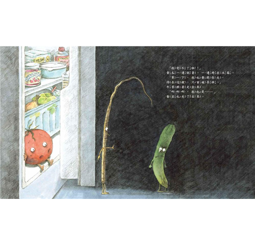 半夜的廚房一個人也沒有,冰箱的門悄悄打開……走出生氣的小黃瓜、番茄和牛蒡,他們因為被人類遺忘決定要逃家,被放到發芽的馬鈴薯也很哀怨,於是,一行人出發參加一場集會……