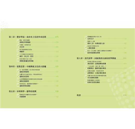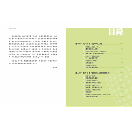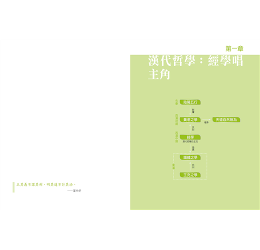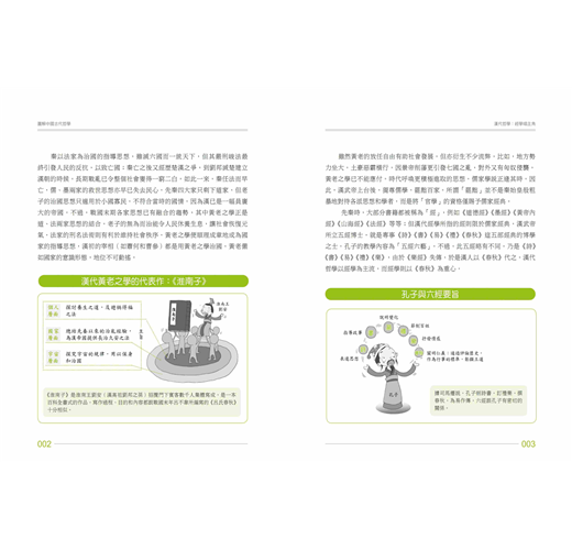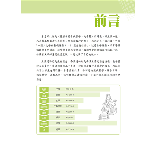本書可謂《圖解中國古代哲學•先秦篇》(簡稱《先秦篇》)的續集,《先秦篇》集中討論先秦思想,本書則縷析由漢至清的思想演變,時間跨度幾乎是《先秦篇》的四倍,內容則分別討論漢代哲學、魏晉玄學、佛家學說、道教思想、宋明理學及清代經學,即以論述漢代經學為始,又以清代經學為終,也算是「有始有終一循環」。