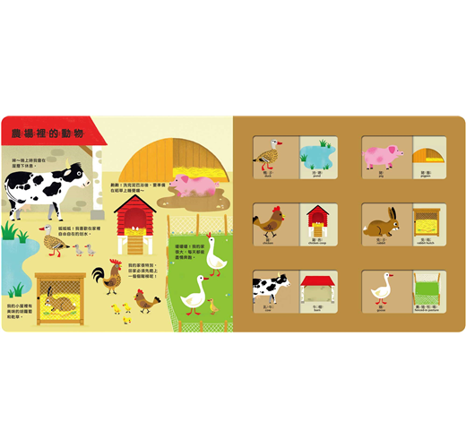特殊的滑板機關設計,為靜態的圖畫書增添了動感,讓認知學習不再只是靜態的觀察,能動手操作玩樂讓閱讀更有樂趣。為了給寶貝良好的閱讀體驗,採用厚實的紙板書,翻頁輕鬆不易損壞。