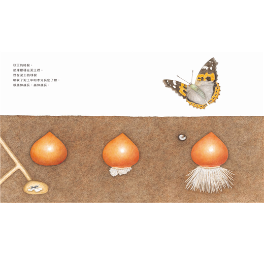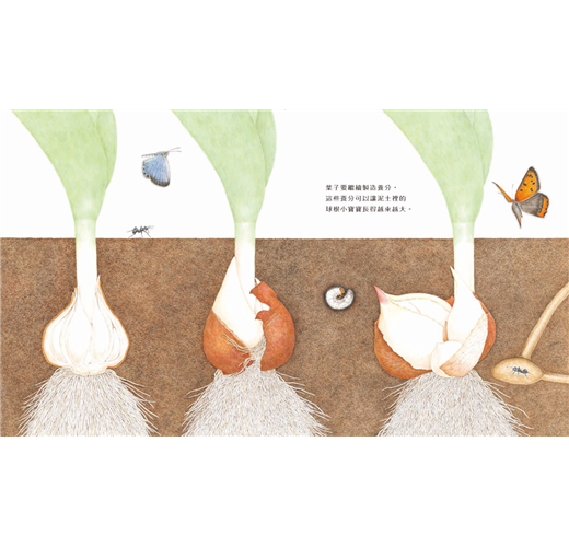在這本書中,有地面地下的對照,有剖面圖的解析,以精密畫的方式詳實展現,才讓我們有機會體會到植物的一生,就像一部精良的機器,每個部位一步一步接棒,將自己的功能發揮到最完美的程度,只為了促成下一代的生生不息。看到最後完全奉獻自己,只剩下薄薄一片的球根媽媽,真讓人感動植物界的母愛同樣非常偉大。