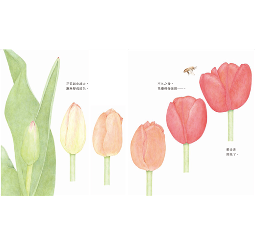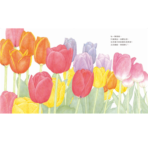 從荒井真紀寫實柔美的筆下,作者以畫筆鏟開密實的泥土,細密的觀察與描繪,讓讀者直擊土中的鬱金香鱗莖,揭開孕育生命剖面結構的奧妙,畫面中,漸漸從地面冒出嫩芽,伸出葉片及含苞的花莖,讓我們欣賞花蕾逐漸開啟花辮的步驟,到花朵漸次凋零的生命描述,清晰明暸的圖畫,讓人感覺到植物的呼吸與運作方式,美麗鮮活的色澤,彷彿能觸摸花瓣的纖緻質地,鬱金香的成長過程,活生生地展現眼前。