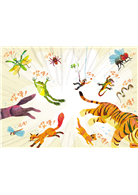 重複的圖像帶給讀者閱讀上的安全感,可是隨著掠食者體型愈來愈大、愈來愈兇猛,也禁不住捏一把冷汗,尤其看到獵人出現時,忍不住想把眼睛捂起來,深怕會有什麼可怕的結局;所以,那陣微風拯救了整個後果,著實讓人鬆了一口氣!最後一個跨頁的立體效果,充分營造身歷其境的閱讀感受,既童趣又驚喜,忍不住菀爾一笑。
