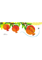 據說,有一顆果子經過八年的時間好不容易才成熟了,「ㄅㄧㄚˊ」一聲,裂了個大縫,香味四溢。一隻嗅覺超靈敏的果蠅聞香而來,望著這一顆紅寶石般的石榴,喜出望外,正想大飽口福時,「哎呀!」這果蠅隱約感覺到背後似乎有八隻眼睛盯著牠,真是不妙。是誰呢?是誰在果蠅的背後打算吃掉牠呢?原來是小蜘蛛,當小蜘蛛張大牠二顆大眼睛以及六顆小眼睛,面帶微笑正想吃掉果蠅時,突然聽到樹葉上有翅膀振動的聲音,是誰呢?是誰偷偷躲在樹葉上,正等著吃掉小蜘蛛呢?咦!這故事聽起來很耳熟,對啦!這本書就是「螳螂捕蟬,黃雀在後」的亮麗繽紛、緊張刺激、豪華加長又充滿猜謎趣味的現代繪本版。