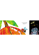 「螳螂捕蟬,黃雀在後。」不只是果蠅,食物鏈的概念貫穿整個文本,果實引發一連串昆蟲及動物角色的出現,除了跨頁滿版,也預留了1/4的最右邊頁面,以強烈突顯的黑底,...