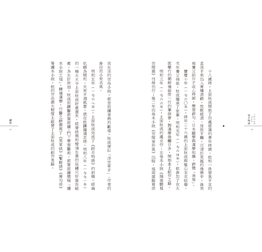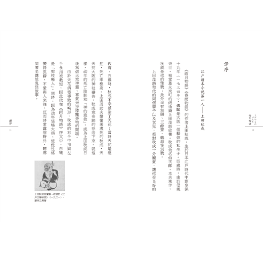 一七三四年-一八○九年。上田秋成是江戶時代浮世草子、讀本小說的著名作者,也是怪談小說的大師。他原名東作,有和譯太郎、剪枝畸人、余齋、無腸等別稱。他是出生於大阪的私生子,生母為一娼妓。三歲時喪母,後來成為紙油商上田氏的養子。四歲時感染皰瘡,因養父向加島稻荷社祈求故,病況由危轉安,使秋成及其養父皆深信神助。但從此雙手各有一指變形縮短。雖然這一項缺憾並不影響秋成的創作活動,但他仍然很在意;也這也就是他日後字號『剪枝畸人』的由來。
