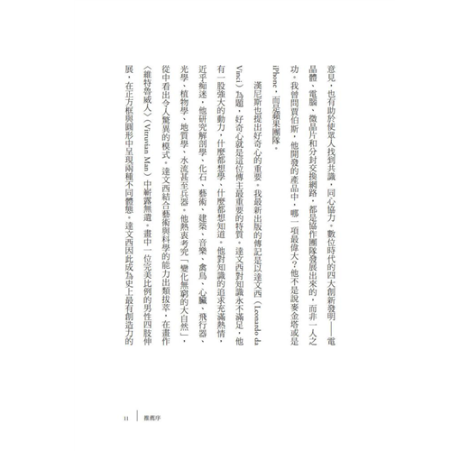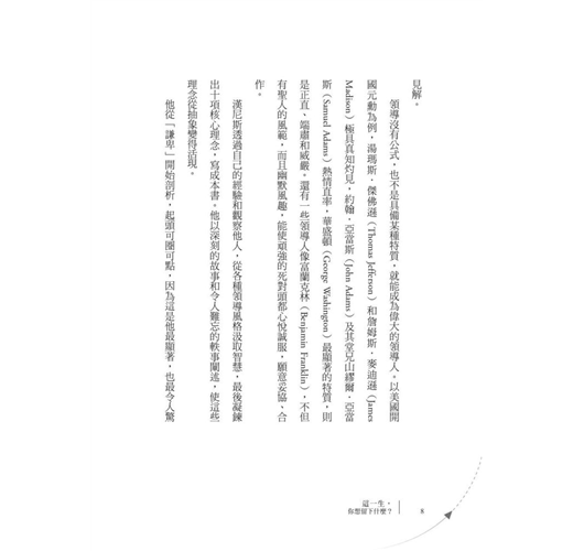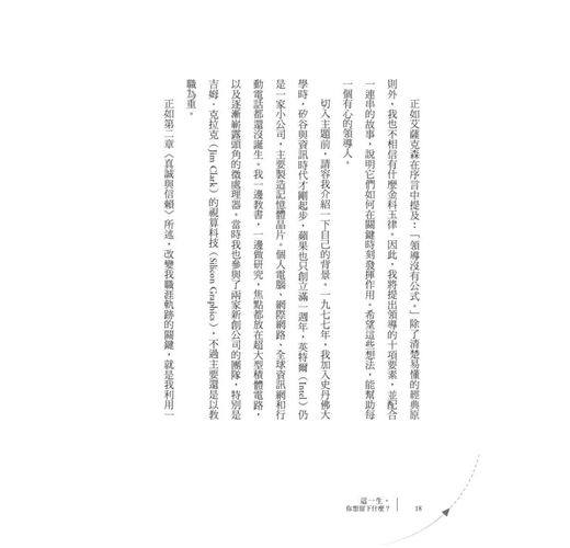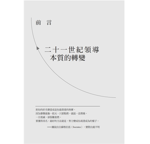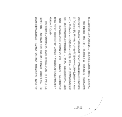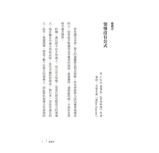 正如艾薩克森在序言中提及:「領導沒有公式。」我也不相信,除了清楚易懂的經典原則外,並沒有什麼金科玉律。因此,我將提出領導的十項要素,並配合一連串的故事,說明它們如何在關鍵時刻發揮作用。希望這些想法,能幫助每一個有心的領導人。