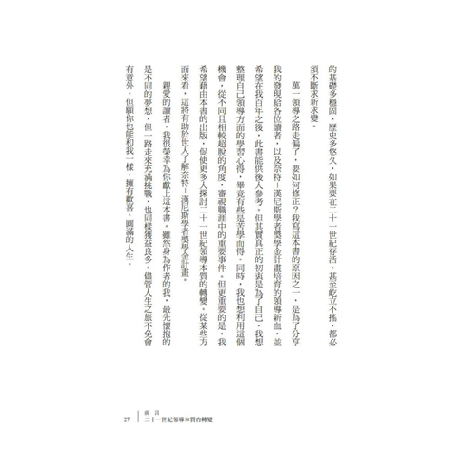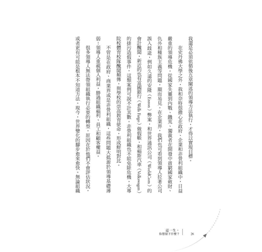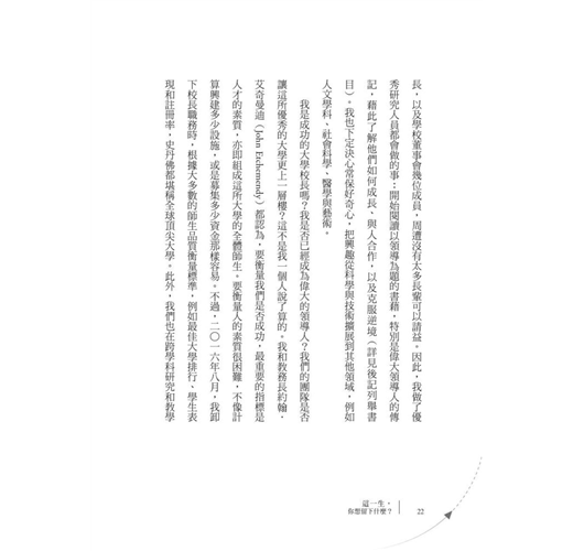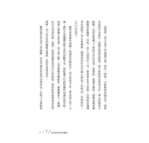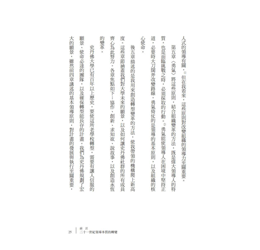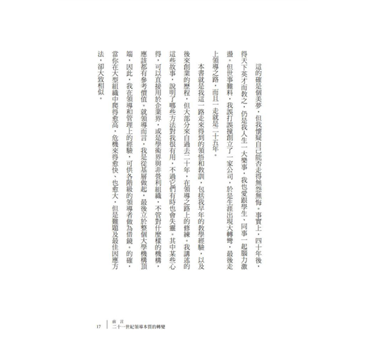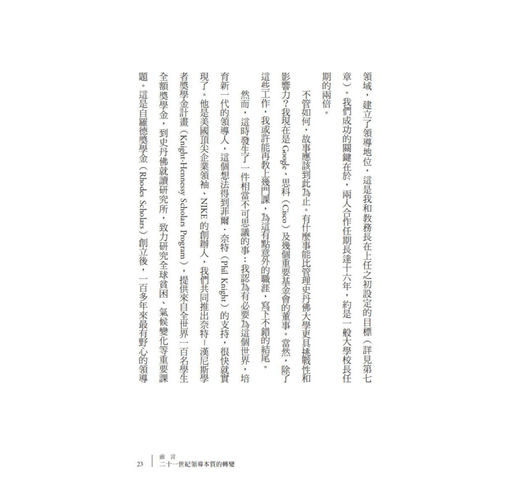 本書就是我這一路走來得到的領悟和教訓,包括我早年的教學經驗,以及後來創業的歷程,但大部分來自過去二十年,在領導之路上的修練。我講述的這些故事,說明了哪些方法對我很有用,不過它們有時也會失靈。其中某些心得,可以直接用於企業界,或是學術界與非營利組織,不管對什麼樣的機構,應該都有參考價值。就領導而言,我是從基層做起,最後立於整個大學機構頂端,因此,我在領導和管理上的經驗,可供各階級的領導者做為借鏡。的確,當你在大型組織中爬得愈高,危機來得愈快、也愈大,但是難題及最佳因應方法,卻大致相似。